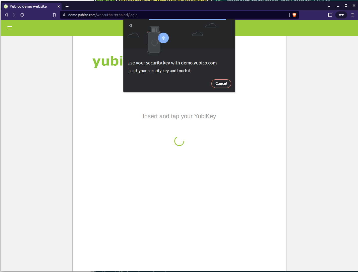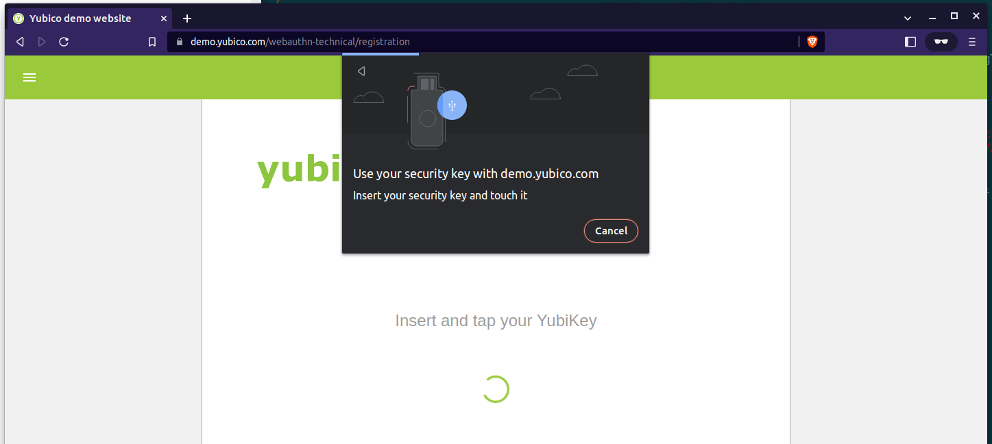 Next 押下すると、ブラウザがセキュリティキー読み取り待機状態になる。